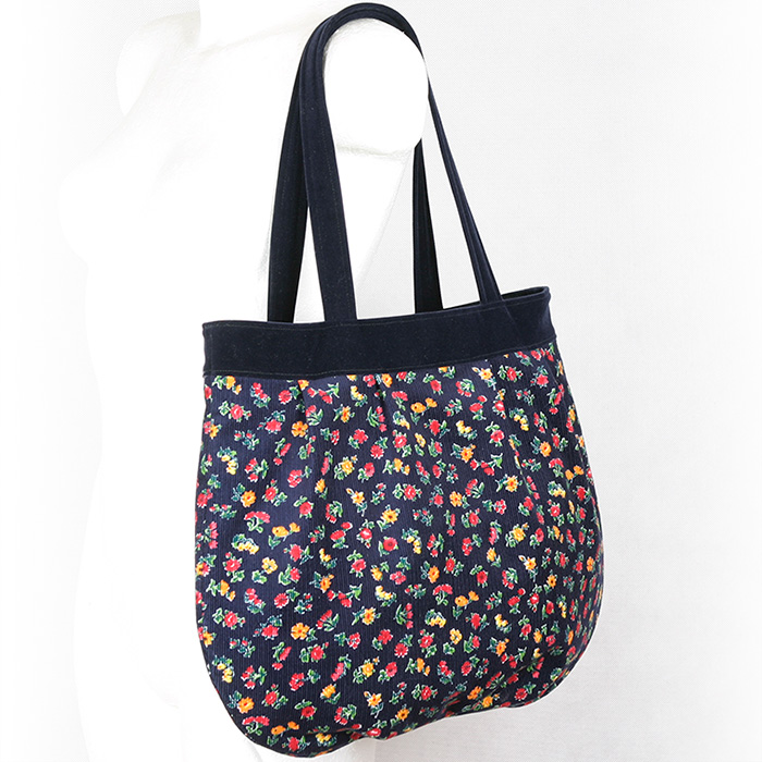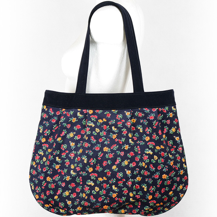 Drugi model, który chcę wam zaprezentować, to dowód na to, że momentami mam ogromną słabość do takich wdzięczno-dziewczęcych wzorów, jak ten w drobne kwiatuszki. Nie walczyłam z sobą i uszyłam torbę 'Dona – multi’. Składa się na nią wspomniany już wzorzysty sztruks i granatowy welur – pojemna, przestronna i z bezpiecznym, zapięciem w postaci suwaka 🙂