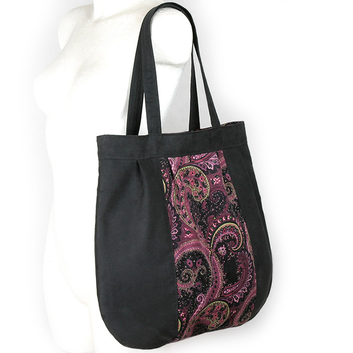Powyższa, to duża torba, lekko marszczona – z czarnej alkantary i wzorzystego sztruksu. Wewnątrz znajduje się podszewka z kieszeniami, zapięcie to zamek błyskawiczny. Jest bardzo pojemna i bez trudu mieści format A4.