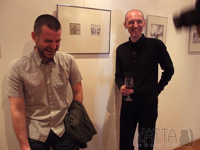 Z dumą patrzyłam na mojego T., który cały czas był zajęty rozmową z osobami zainteresowanymi jego twórczością i techniką pracy. Tak, macie rację, właśnie chwalę się koszmarnie i nieprzyzwoicie. Bardzo cenię to, co T. robi, mimo, że życie z artystą, to czasami ciężki kawałek chleba, czy jakoś tak ;)))