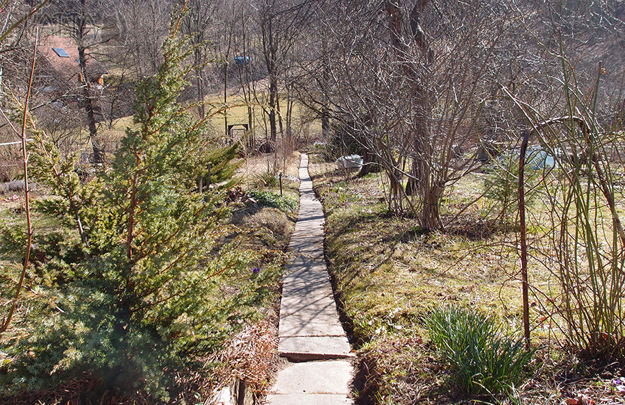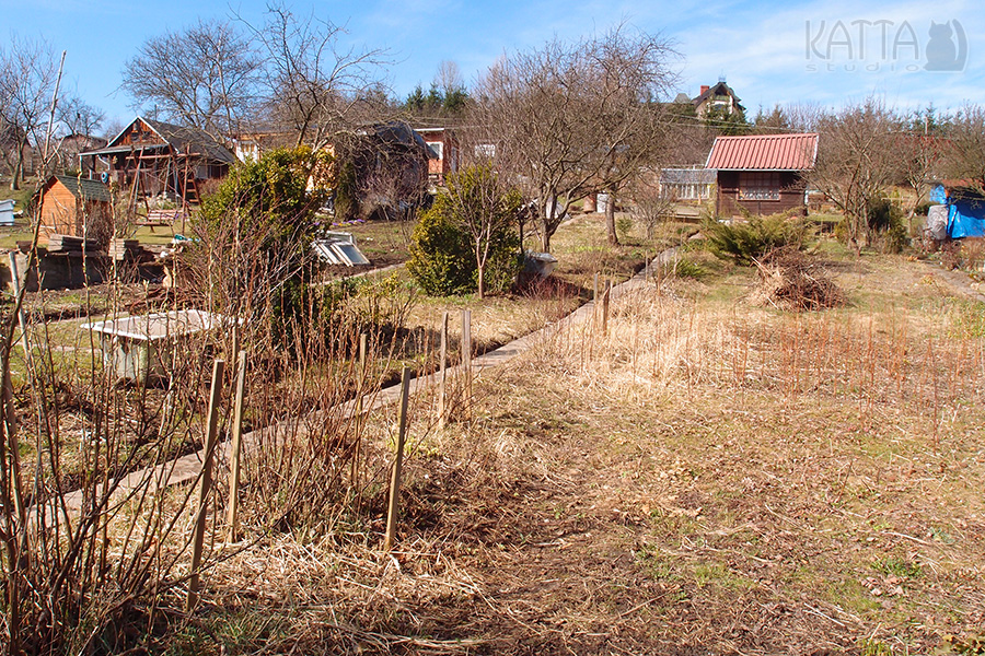 Na dwóch poniższych zdjęciach mamy jako tako całościowy widok na działkę z góry i z dołu. Te podłużne, wyłożone płytami ścieżki, to 'urzędowe’ granice pomiędzy poszczególnymi działkami. Sami więc widzicie, że ktoś to kiedyś rozparcelował średnio mądrze i zrobił ogródki w kształcie długich, wąskich pasów ziemi. Na szczęście udało mi się zostać właścicielką dwóch takich pasków, dzięki czemu ogródek zrobił się troszkę szerszy.