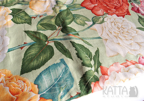 Uwielbiam lumpeksy, za to jakie piękne tkaniny można tam upolować. I dzisiaj chwalę się moją wczorajszą zdobyczą. Jest to fantastyczne, nowiutkie płótno, pokryte różanym wzorem. Oprócz części głównej ma jeszcze doszyte trzy kawałki możliwych wersji kolorystycznych – taka klasyczna tkanina reprezentacyjna, ze sklepu z materiałami do wystroju wnętrz.